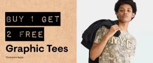 Hurry in and save! Shop in store and enjoy our buy 1, get 2 free on graphic tees.