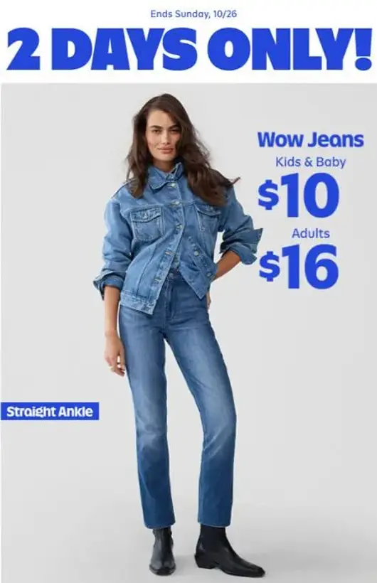 Offer valid 10/22/25 - 11/6/25 at Old Navy stores in the United States (including Puerto Rico). Excludes Clearance & Maternity. Select styles only. While supplies last. No adjustments on previous purchases. Cannot be combined with other offers or discounts, including Gap Inc. employee discount.