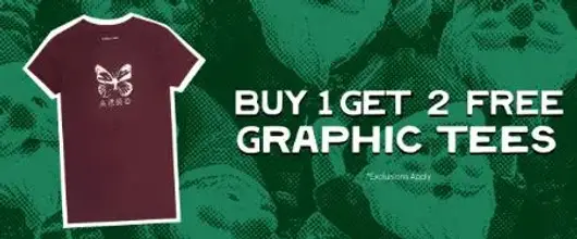 Hurry in and save! Shop in store and enjoy our buy 1, get 2 free on graphic tees.