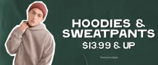 Limited time only! Shop in store and get $13.99 & up on hoodies & sweatpants.